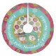 Say Merry Christmas in Spanish with this colourful, fun holiday tree skirt featuring snowflake orbs on hot pink, a row of aqua blue, snowflake orbs on white, a snowman couple wearing hats, scarves, and carrot noses, a few white snowflakes, and white text that reads Feliz Navidad!