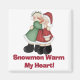 A snowman couple embraces in a hug and text reads "Snowmen Warm My Heart" on snowman holiday t-shirts, hoodies, sweatshirts, mugs, cards, stickers, tote bags, and other snowman clothing and gifts.