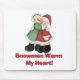 A snowman couple embraces in a hug and text reads "Snowmen Warm My Heart" on snowman holiday t-shirts, hoodies, sweatshirts, mugs, cards, stickers, tote bags, and other snowman clothing and gifts.