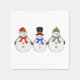 Three cute snowmen wearing scarves and each with a special decorated outfit. A Santa hat, a beanie and a top hat.