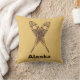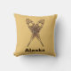A crossed pair of snowshoes on a background colour suggesting braintan leather. Customisable text reading "Alaska" also appears. There are several different styles of traditional snowshoes. Those pictured here are made of Ash and moosehide babiche (webbing) in the Alaskan pattern. Longer and thinner than some other styles, such as the bearpaw, Alaskan snowshoes allow for a more natural gate and are well suited for cross-country travel. The slightly upturned tips allow you to drag your feet a bit. Be advised snowshoes can make for excellent skies; generally at the worst possible moment.