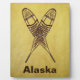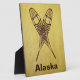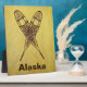 A crossed pair of snowshoes on a braintan leather background. Customisable text reading "Alaska" also appears. There are several different styles of traditional snowshoes. Those pictured here are made of Ash and moosehide babiche (webbing) in the Alaskan pattern. Longer and thinner than some other styles, such as the bearpaw, Alaskan snowshoes allow for a more natural gate and are well suited for cross-country travel. The slightly upturned tips allow you to drag your feet a bit. Be advised snowshoes can make for excellent skies; generally at the worst possible moment.