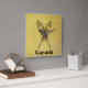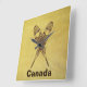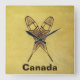 A crossed pair of snowshoes on a braintan leather background. Customisable text reading "Canada" also appears. There are several different styles of traditional snowshoes. Those pictured here are made of Ash and moosehide babiche (webbing) in the Alaskan pattern. Longer and thinner than some other styles, such as the bearpaw, Alaskan snowshoes allow for a more natural gate and are well suited for cross-country travel. The slightly upturned tips allow you to drag your feet a bit. Be advised snowshoes can make for excellent skies; generally at the worst possible moment.