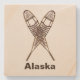 A crossed pair of snowshoes. Customisable text reading "Alaska" also appears. There are several different styles of traditional snowshoes. Those pictured here are made of Ash and moosehide babiche (webbing) in the Alaskan pattern. Longer and thinner than some other styles, such as the bearpaw, Alaskan snowshoes allow for a more natural gate and are well suited for cross-country travel. The slightly upturned tips allow you to drag your feet a bit. Be advised snowshoes can make for excellent skies; generally at the worst possible moment.