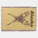 A crossed pair of snowshoes on a background colour suggesting braintan leather. Customisable text reading "Alaska" also appears. There are several different styles of traditional snowshoes. Those pictured here are made of Ash and moosehide babiche (webbing) in the Alaskan pattern. Longer and thinner than some other styles, such as the bearpaw, Alaskan snowshoes allow for a more natural gate and are well suited for cross-country travel. The slightly upturned tips allow you to drag your feet a bit. Be advised snowshoes can make for excellent skies; generally at the worst possible moment.