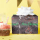 Beautiful winter wonderland during the night with snowy Christmas tree all aglow with old-fashioned brightly coloured big light bulbs and the ground and trees all covered in snow. Merry Christmas typography in green colour. Original Photography © TamiraZDesigns.