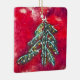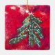 Image of a felted wool Christmas tree with stitching and beads for accents. Green tree with red background on a ceramic square for your Christmas tree. An ornament.