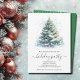 A snowy decorated Christmas tree accents these holiday party invitations with your details in chic lettering.