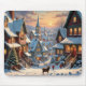 A picturesque winter village is adorned with snow-covered rooftops and warmly lit windows with people and a reindeer walking the snowy street.