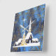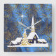 Christmas clock with an old-fashioned silhouette of a church in the snow on Christmas Eve and sparkling tree branches all around. Decorate with a subdued, vintage religious theme this Christmas with this clock featuring a dark blue, white and gold painting of a starry Christmas night. Perfect for a "Silent Night" theme.