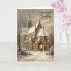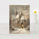This card shows a snowy winter night with a tall Gothic church at the center, its roof and stone details covered in white. Bare trees stand on both sides, their thin branches traced with snow against a gray, cloudy sky. Warm amber light shines from the church windows, and the open doorway glows the brightest. A small couple, shown in dark silhouette, stands near the entrance as if they’re about to step inside together. The soft light spills onto the snow-covered path, giving the scene a cozy, caring feel that fits romance and togetherness ❤️🍫. In the upper right corner, the words “Season’s Greetings” appear in a neat script style, standing out clearly against the sky.