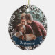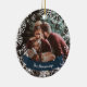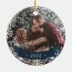 Festive photo Christmas ornament features a favourite photo on each side, framed by a round border of white snowflakes. Personalise with a custom caption on each side; shown with names and the year.
