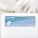 Snowy Egret in Flight on Florida Beach. White egret flying on the beach with blue water, sand, and ocean waves. Coastal beach decor with crystal clear blue tropical water and white sea foam with snowy egret in flight.