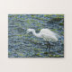 This puzzle features an image of a Snowy Egret wading in the waters of a blue green lake.