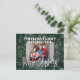Holiday season greetings with green Christmas details, snow and family photo.