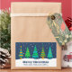 A modern geometric design of five fir trees in teal, turquoise and golden yellow. The sky is navy blue with white falling snow. The text says "Merry Christmas" with a section for a custom name or family.