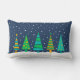A modern geometric design of five fir trees in teal, turquoise and golden yellow. The sky is navy with white falling snow.