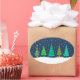 A modern geometric design of five fir trees in teal, turquoise and golden yellow. The sky is navy with white falling snow.