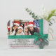 An attractive and eye catching Christmas card with your family photo highlighted by snowy Christmas green ribbon with your Christmas message and names below. Backside features a repeating pattern of the gold Merry Christmas against a dark red.