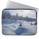 This photo features a simple landscape with deep drifts of snow, deep shadows, and snow laden trees.