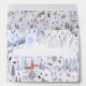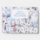 A cute and beautifully detailed watercolor-painted bustling mountain alpine ski village with snowy mountains, chalets and shopkeepers, skiers skiing, visitors building snowmen, villagers gathering, children playing, dogs barking and Christmas bells a'ringing in this illustrated winter holiday pattern for this holiday party envelope and Christmas card envelope.