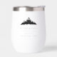 These wintry chic wine tumblers make great bridal party gifts or destination wedding favours for your winter wedding or ski resort wedding. Clean minimal design features your n names, wedding date, and location in classic black serif lettering. A snowy mountain peak illustration in black completes the design.