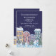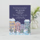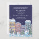 A charming winter-scene featuring snow-covered homes on a snowy night. Suitable as a moving announcement, Christmas party, Open House and more.