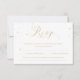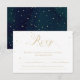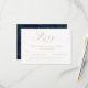 A calligraphy wedding rsvp card, features a dark blue watercolor background with the wording in gold.