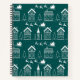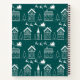 Minimalist Nordic winter villages with Santa and his reindeer glide above cozy snowy houses and pine trees.