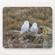 Original photo of a pair of snowy owls sitting on a driftwood log by the beach surrounded by dried grass and flowers.