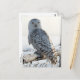 Animal card showing a snowy owl sitting on a fence. The snowy owl (Bubo scandiacus) is a large owl of the typical owl family Strigidae. This yellow-eyed, black-beaked white bird is easily recognizable. It is one of the largest species of owl and, in North America, is on average the heaviest owl species. The adult male is virtually pure white, but females and young birds have some dark scalloping; the young are heavily barred, and dark spotting may even predominate. Its thick plumage, heavily feathered taloned feet, and colouration render the snowy owl well-adapted for life north of the Arctic Circle.