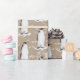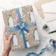 Penguins surrounded by snow on Kraft paper gift wrap.