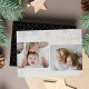 Simple and modern holiday card design features two of your favourite photos with an offset alignment, framed by falling snowflakes. "Merry Christmas" appears in gold foil casual handwritten script lettering, with your family name and the year at the lower left corner. A unique contemporary design in a horizontal or landscape layout for an on-trend holiday look.