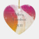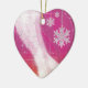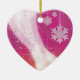 Beautiful ornate Christmas ornament features a snowy white ribbon of light and stars against a damask flourish background with a bright pink and yellow sunset background. Three white snowflakes hang in the upper right corner. Personalise the back with your own message and date!