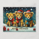 Three cute baby lions with Santa Hats and Christmas gifts on the snowy background postcard.