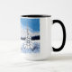 A mug with a beautiful winter scene including snowy mountains, rustic cabin and snow covered evergreens. The image and text can be personalized. Original artwork by W.B.