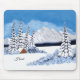 A mouse pad with a beautiful winter scene including snowy mountains, rustic cabin and snow covered evergreens. The image and text can be personalized. Original artwork by W.B.