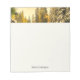 A notepad with a beautiful nature photograph along the top. Tops of snow covered pine trees in view.