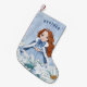 This adorable snowy winter Princess stocking features a beautiful young princess with red hair wearing a blue and white snowflake gown and warm fur lined cape. The princess is surrounded by poinsettias. You can personalise with your princess's name!