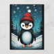 This elegant Christmas holiday design features a cute penguin wearing a Santa hat on a snowy winter.