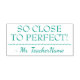 This inspirational rubber stamp design features the praise message "SO CLOSE TO PERFECT!" and a personalised teacher's or educator's name. It could be used by a teacher, educator, instructor, or tutor when marking assignments, to indicate that the student has done a great job.