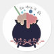 A colourful cauldron with pink, blue and turquoise bubbles. Finished with a decorative pretty pink bow. The text, “So Mote It Be” can be personalised. The background of the stickers is white. Crafting, birthday gifts, spell work, witchy stationary to seal a spell.
