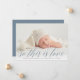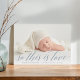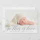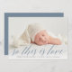 A sweet and elegant birth announcement design featuring a full bleed horizontal or landscape orientated photo with "so this is love" overlaid in chic calligraphy script lettering. Your baby's name and birth stats appear beneath in classic grey. Add three additional square photos to the back, along with a personal message.