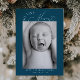 Elegant Christmas birth announcement card featuring typography that says "so very merry" with a heart. This is a birth announcement card for the holiday seasons! Add your photos, birth stats, and a message! Vertical photo works best on the front. The background is teal.