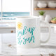 Celebrate summer with our cute quote mug featuring "soak up the sun" in vibrant turquoise teal handwritten style typography with a bright yellow sun illustration.