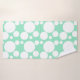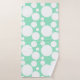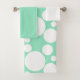 This towel set has a white washcloth, a pale green hand towel, and a bath towel with a mid-century modern design of white circles of varying sizes on a field of pale green. If you like the design but prefer different colours, message me.