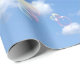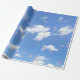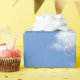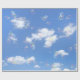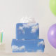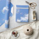 Iridescent soap bubble pattern on blue sky with white fluffy clouds