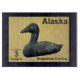 A postage stamp from a mythical independent Alaska featuring a soapstone carving of an Eider Duck. The background is brain tanned moose hide. This is a digital rendering, not an actual soapstone object. The Common Eider, Somateria mollissima, is the largest duck found in Europe and in North America (except for the Muscovy Duck which only reaches North America in a wild state in southernmost Texas) The Eider is distributed over the northern coasts of Europe, North America and eastern Siberia. It breeds in Arctic and some northern temperate regions, but winters somewhat farther south in temperate zones, when it can form large flocks on coastal waters. It can fly at speeds up to 70 mph (113 km). The Eider is chraacterised by its bulky shape and large, wedge-shaped bill. The male is unmistakable, with its black and white plumage and green nape. The female is a brown bird, but can still be readily distinguished from all ducks, except other eider species, on the basis of size and head shape. This duck's call is a pleasant "ah-ooo." The species is often readily approachable. Drakes of the European, eastern North American and Asia/western North American races can be distinguished by minor differences in plumage and bill colour. This species dives for crustaceans and molluscs, with mussels being a favored food. The Eider will eat mussels by swallowing them whole; the shells are then crushed in their stomachs and excreted. When eating a crab the Eider will remove all of its claws and legs and then eat the body in a similar fashion. It is abundant, with populations of about 1.5-2 million birds in both North America and Europe, and also large but unknown numbers in eastern Siberia. A particularly famous colony of eiders lives on the Farne Islands in Northumberland, England. These birds were the subject of one of the first ever bird protection laws, established by Saint Cuthbert in the year 676. About 1,000 pairs still nest there every year. Because St. Cuthbert is the patron saint of Northumberland, it was natural that the eider should be chosen as the county's emblem bird; the birds are still often called Cuddy's ducks in the area, "Cuddy" being the familiar form of "Cuthbert". The Common Eider is one of the species to which the Agreement on the Conservation of African-Eurasian Migratory Waterbirds (AEWA) applies. Eiders are colonial breeders. They nest on coastal islands in colonies ranging in size of less than 100 to upwards of 10,000-15,000 individuals. Female eiders frequently exhibit a high degree of natal philopatry, where they return to breed on the same island where they were hatched. This can lead to a high degree of relatedness between individuals nesting on the same island, as well as the development of kin-based female social structures. This relatedness has likely played a role in the evolution of co-operative breeding behaviours amongst eiders. Examples of these behaviours include laying eggs in the nests of related individuals and crèching, where female eiders team up and share the work of rearing ducklings. The eider's nest is built close to the sea and is lined with the celebrated eiderdown, plucked from the female's breast. This soft and warm lining has long been harvested for filling pillows and quilts, but in more recent years has been largely replaced by down from domestic farm-geese and synthetic alternatives. Although eiderdown pillows or quilts are now a rarity, eiderdown harvesting continues and is sustainable, as it can be done after the ducklings leave the nest with no harm to the birds.
