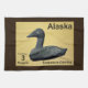 A postage stamp from a mythical independent Alaska featuring a soapstone carving of an Eider Duck. The background is brain tanned moose hide. This is a digital rendering, not an actual soapstone object. The Common Eider, Somateria mollissima, is the largest duck found in Europe and in North America (except for the Muscovy Duck which only reaches North America in a wild state in southernmost Texas) The Eider is distributed over the northern coasts of Europe, North America and eastern Siberia. It breeds in Arctic and some northern temperate regions, but winters somewhat farther south in temperate zones, when it can form large flocks on coastal waters. It can fly at speeds up to 70 mph (113 km). The Eider is chraacterised by its bulky shape and large, wedge-shaped bill. The male is unmistakable, with its black and white plumage and green nape. The female is a brown bird, but can still be readily distinguished from all ducks, except other eider species, on the basis of size and head shape. This duck's call is a pleasant "ah-ooo." The species is often readily approachable. Drakes of the European, eastern North American and Asia/western North American races can be distinguished by minor differences in plumage and bill colour. This species dives for crustaceans and molluscs, with mussels being a favored food. The Eider will eat mussels by swallowing them whole; the shells are then crushed in their stomachs and excreted. When eating a crab the Eider will remove all of its claws and legs and then eat the body in a similar fashion. It is abundant, with populations of about 1.5-2 million birds in both North America and Europe, and also large but unknown numbers in eastern Siberia. A particularly famous colony of eiders lives on the Farne Islands in Northumberland, England. These birds were the subject of one of the first ever bird protection laws, established by Saint Cuthbert in the year 676. About 1,000 pairs still nest there every year. Because St. Cuthbert is the patron saint of Northumberland, it was natural that the eider should be chosen as the county's emblem bird; the birds are still often called Cuddy's ducks in the area, "Cuddy" being the familiar form of "Cuthbert". The Common Eider is one of the species to which the Agreement on the Conservation of African-Eurasian Migratory Waterbirds (AEWA) applies. Eiders are colonial breeders. They nest on coastal islands in colonies ranging in size of less than 100 to upwards of 10,000-15,000 individuals. Female eiders frequently exhibit a high degree of natal philopatry, where they return to breed on the same island where they were hatched. This can lead to a high degree of relatedness between individuals nesting on the same island, as well as the development of kin-based female social structures. This relatedness has likely played a role in the evolution of co-operative breeding behaviours amongst eiders. Examples of these behaviours include laying eggs in the nests of related individuals and crèching, where female eiders team up and share the work of rearing ducklings. The eider's nest is built close to the sea and is lined with the celebrated eiderdown, plucked from the female's breast. This soft and warm lining has long been harvested for filling pillows and quilts, but in more recent years has been largely replaced by down from domestic farm-geese and synthetic alternatives. Although eiderdown pillows or quilts are now a rarity, eiderdown harvesting continues and is sustainable, as it can be done after the ducklings leave the nest with no harm to the birds.