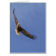 An adult bald eagle in a sharp turn highlighted by a blue sky.